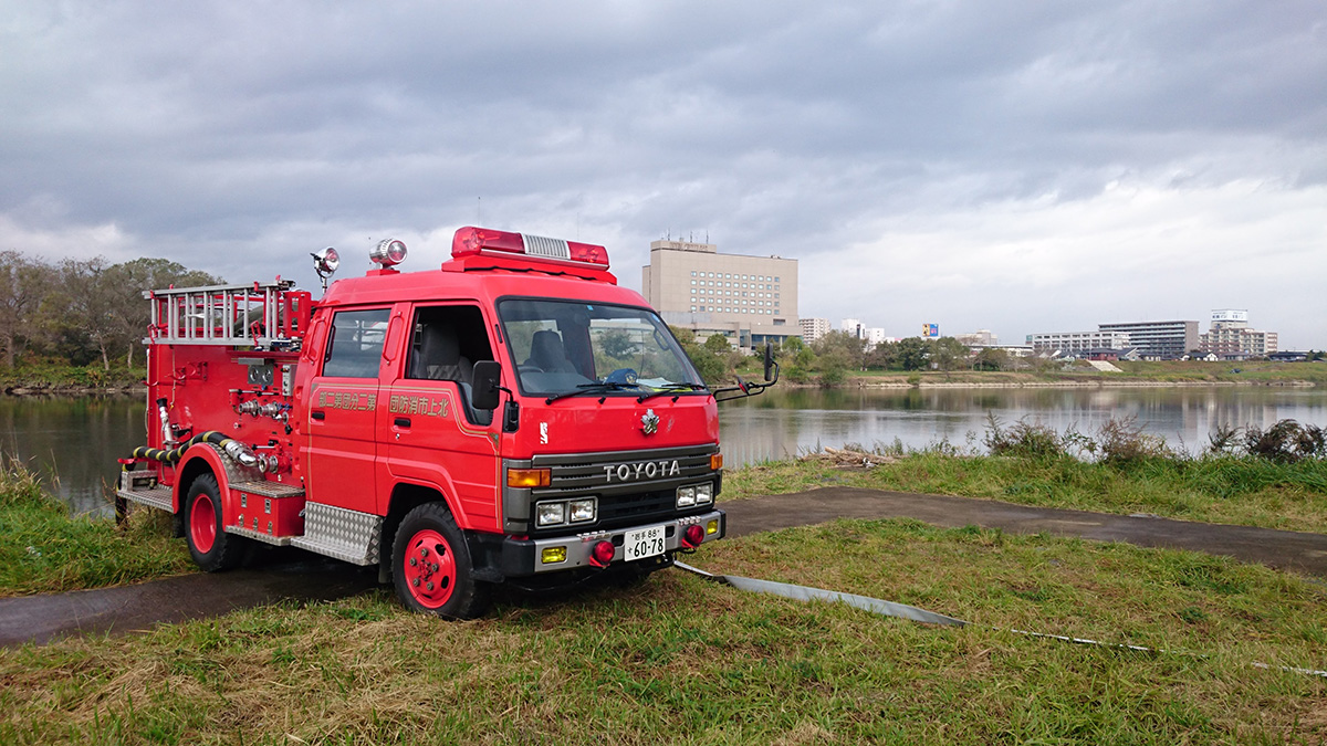 火災時の主な役割は、消防署隊の後方支援となります。水利(消火栓や河川など)を取り、署隊に中継送水したり、周辺への延焼阻止を図ります。